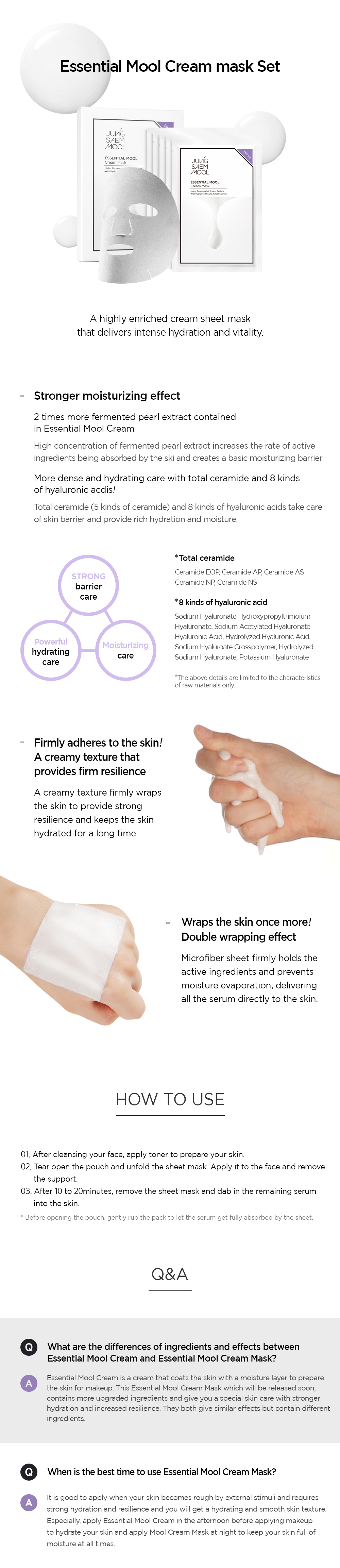| How to use | 1) After washing your face, use lotion to smooth out your skin texture. 2) Open the pouch, unfold the sheet, attach it to your face, and then remove the support. 3) After 10 to 20 minutes, remove the sheet and lightly pat the remaining essence on the skin to allow absorption. * It is recommended that you massage the pouch properly before opening and use it on the back after allowing the contents to fully soak into the sheet. |